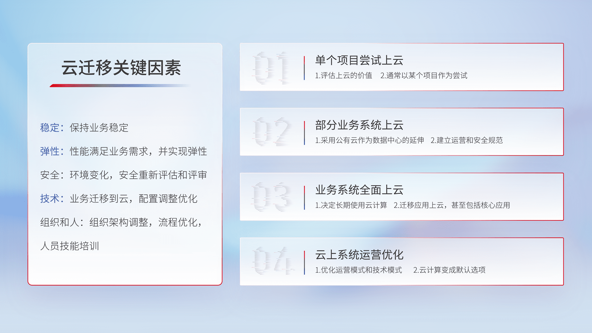 结合实际业务,,从规划设计、、、云平台选型、、云原生改造、、、数据迁移、、、、集成交付,,迁移全过程为客户识别最佳上云路径,,,做好风险识别管理,,,,设计网络架构、、身份权限、、、、安全审计合规、、操作审计、、、、日志审计、、、、监控告警策略、、、多站点容灾设计等,,对云上基础设施进行整体规划,,,,提升IT治理水平,,,,以满足弹性、、高可用、、、、高性能的需求。。。